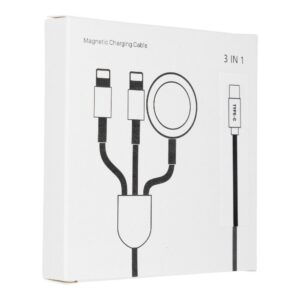 Praktisches 3-in-1 Zubehör für Mobilgeräte: Kabel mit iPhone Lightning-Stecker, Typ-C-Stecker und kabellosem Ladegerät für Apple iWatch. Ermöglicht das gleichzeitige effiziente Laden von bis zu 3 Geräten. Geeignet für Apple iWatch, iPhone, iPad und mehr. Ein äußerst praktisches Zubehör speziell für Apple-Liebhaber. Dank des integrierten Lightning-Steckers für iPhone können Sie Ihr Apple iPhone laden. Der zweite Stecker, Typ C, ermöglicht das gleichzeitige Laden eines weiteren Geräts. Das integrierte kabellose Ladegerät für die Apple iWatch lädt Ihre Smartwatch, während Sie zwei weitere Geräte mit Strom versorgen. Mit dieser Lösung benötigen Sie keine zusätzlichen Ladegeräte – alles, was Sie brauchen, ist das C3169 Kabel. Die optimale Kabellänge von 120 cm sorgt für einen hohen Komfort bei der Nutzung und ermöglicht Ihnen, frei mit Ihrem Smartphone zu arbeiten, während es geladen wird. Speziell entwickelt für Apple Geräte. Technische Daten: Funktionen: Laden Eingang iWatch kabelloses Ladegerät: 5V/1A Leistung des iWatch kabellosen Ladegeräts: 3W Kabelausgang: 5V/2A Stecker: USB-C / Lightning, USB-C, iWatch kabelloses Ladegerät Kabellänge: 120 cm Länge der Seitenkabel: 20 cm Gewicht: 50 g Geeignet für: Apple iWatch, iPhone, iPad und weitere Geräte.