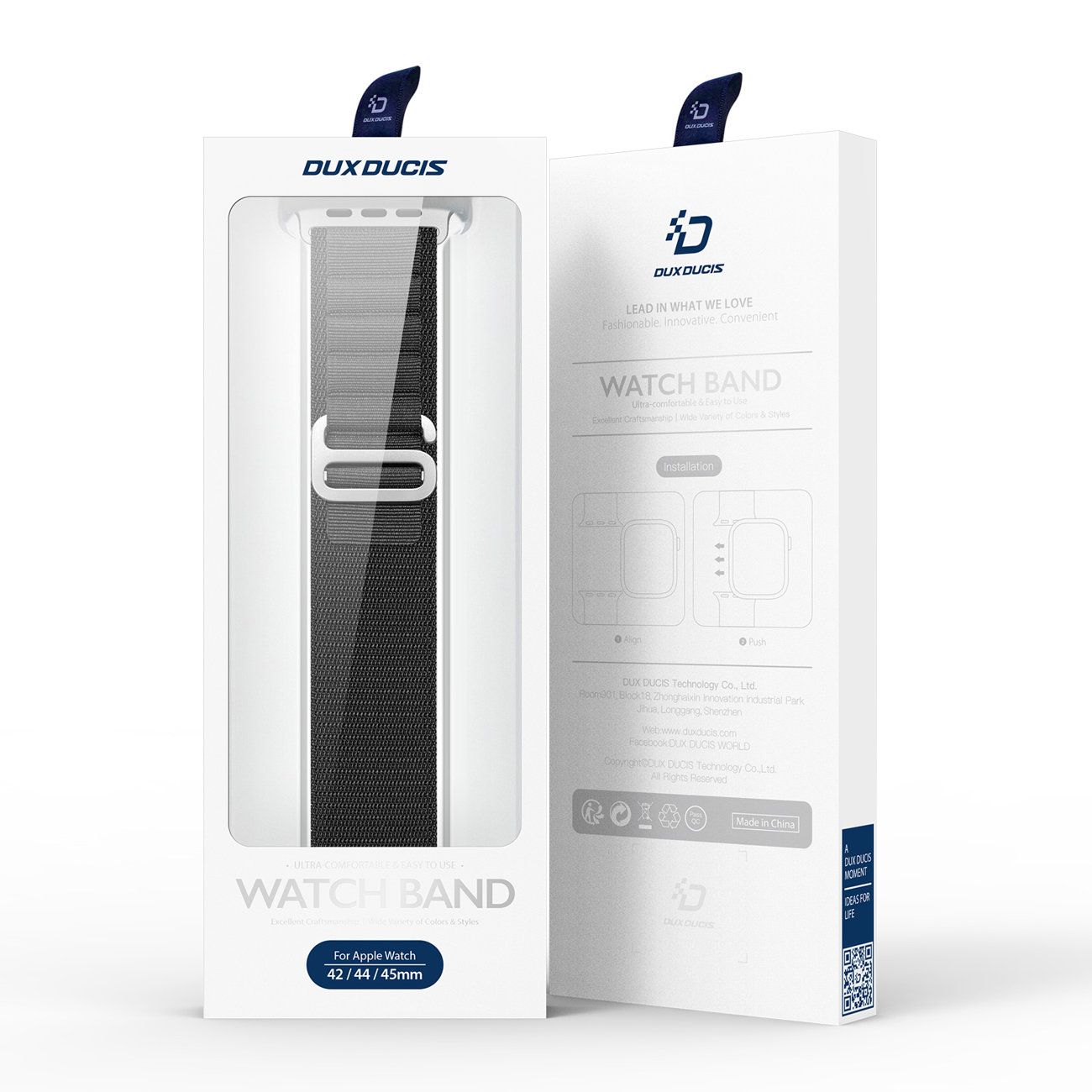 Das DUX DUCIS GS Apple Watch Armband aus flexiblem Nylon mit einer Edelstahl-Schließe ist ein elegantes und äußerst bequemes Accessoire. Es lässt sich leicht an- und ablegen und sitzt perfekt am Handgelenk.