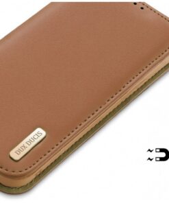 Dux Ducis Hivo Flip Lederhülle. Sie verfügt über ein Innenfach für Karten, Dokumente oder Geld mit einer Beschichtung, die RFID-Signale blockiert. Zudem dient sie als Ständer und bietet praktische Fächer für Karten und Bargeld.
