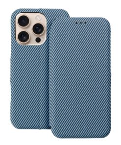 Das Folio Side Magnet Case besteht aus robustem Öko-Leder. Seine Oberfläche ist mit einem eleganten Carbon-Muster verziert, das den modernen Charakter des Geräts unterstreicht. Die mittlere Materialflexibilität bietet effektiven Schutz und sorgt zugleich für Komfort.