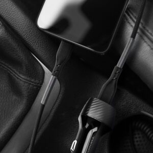 Das Carbonfaser-Muster verleiht dem Kabel ein sportliches Erscheinungsbild. Das Zubehör passt perfekt zum Interieur jedes Fahrzeugs. Das Kabel ist nicht nur praktisch, sondern auch ein exklusives Auto-Gadget.