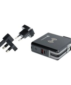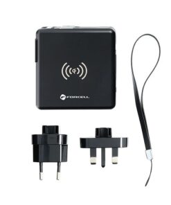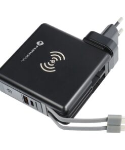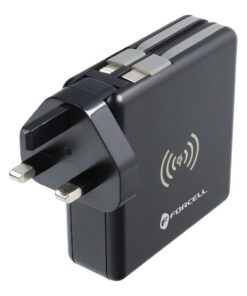Perfektes Reise-Set: Multifunktionales Ladegerät FORCELL 5in1. Ausgestattet mit USB-C- und USB-A-Anschlüssen sowie einer Powerbank. Unterstützt kabelloses Laden.