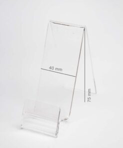 Vertikale Handyhalterung aus Plexiglas mit Platz für Preisschild.