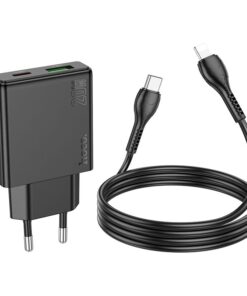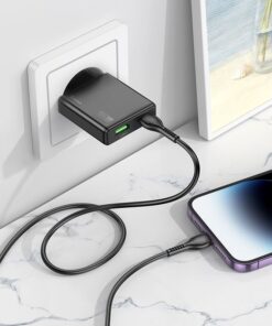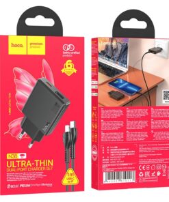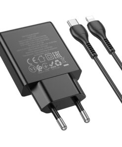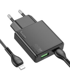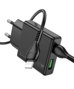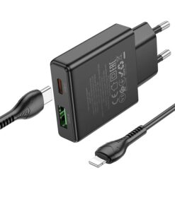 Hoco N38 Wandladegerät mit Schnellladefunktion und dualem Ausgang. Ermöglicht superschnelles Laden mobiler Geräte. Ein 1 Meter langes USB-C-zu-Lightning-Kabel ist inklusive.