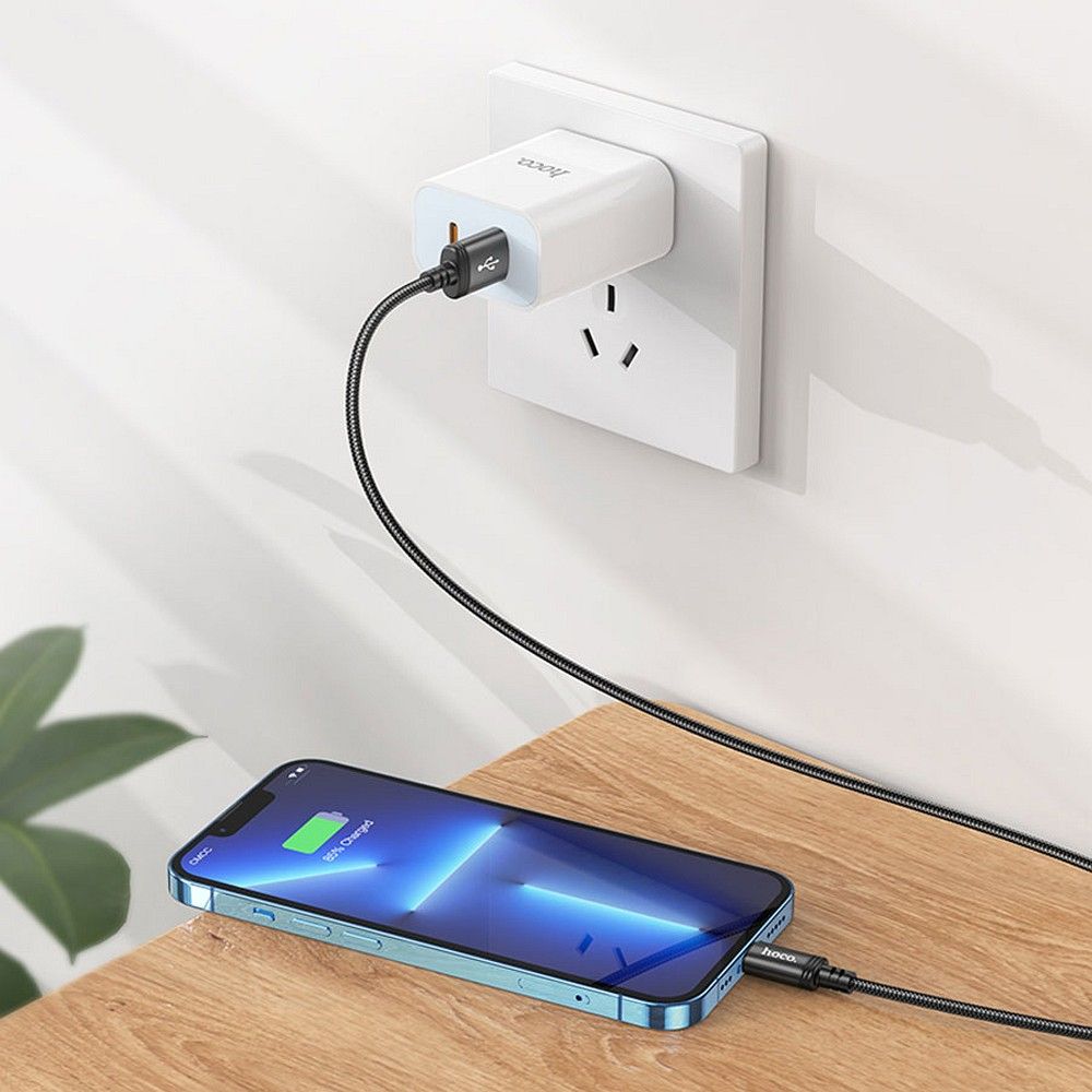 Hoco X91 Kabel mit USB-A- und Lightning-Anschluss. Unterstützt Laden und Datenübertragung.