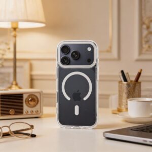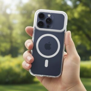 Die transparente Rückseite in Kombination mit einem metallischen Akzent hebt das Design des Telefons hervor, ohne dabei den Schutz zu beeinträchtigen.
