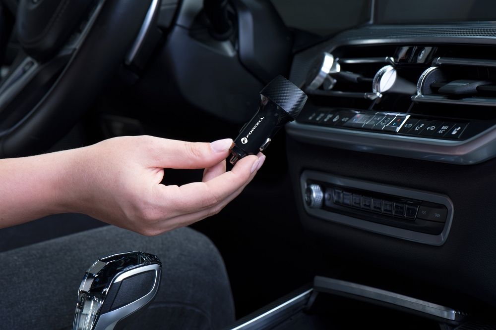 Extrem funktionales Autoladegerät der FORCELL CARBON Serie mit zwei USB-C-Anschlüssen. Unterstützt das Schnellladeprotokoll PD 3.0 und verfügt über ein mehrstufiges Schutzsystem.