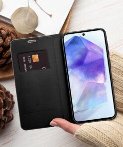 Elegantes Case mit Metallrahmen für verbesserten Schutz des Telefons. Die attraktive Textur und das angenehme, griffige Material schaffen ein stylisches Case, das das moderne Design des Geräts unterstreicht. Weiches Veloursmaterial im Inneren und im Halterteil schützt das Gerät von beiden Seiten vor Schäden und Kratzern. Der Halter ist aus elastischem Silikon gefertigt und verfügt über Aussparungen. Der Aluminiumrahmen an den Kanten verstärkt das Case und bietet zusätzlichen Schutz für das Gerät. Die Kombination aus Metall und Originalmaterial ergibt eine einzigartige und moderne Komposition, dank der das Gerät stilvoll und elegant wirkt. Das Case verfügt zudem über eine kleine Tasche für praktische Dokumente oder Geldscheine. Es ist mit einer horizontalen Basis ausgestattet, die das Ansehen von Filmen oder Fotos erleichtert. Ein starker Magnet sorgt für leichtes Schließen und Öffnen des Holsters und verhindert ein unbeabsichtigtes Öffnen.