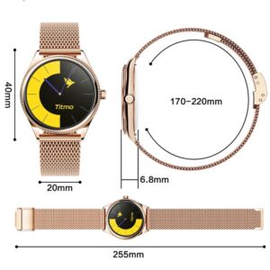 Die Titmo O-170 besticht durch elegante, feminine Linien, die ihr ein stilvolles Erscheinungsbild verleihen. Die Uhr verfügt über ein schlankes Profil und sitzt angenehm am Handgelenk. Das Display wird von gehärtetem Glas geschützt, das kratz- und stoßfest ist. Mit einer Auswahl an Zifferblatt-Designs in unterschiedlichen Stilen lässt sich die Uhr mühelos an verschiedene Anlässe und persönliche Vorlieben anpassen.