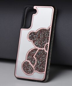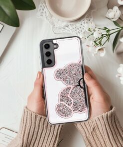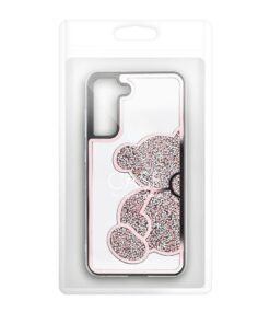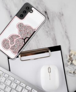 Die Teddy Bear Hülle ist eine stilvolle und funktionale Schutzhülle, die sich durch ein charakteristisches, glitzerndes Teddybär-Muster, erhöhte Kanten und Kunststoffmaterial auszeichnet.