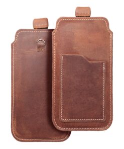 Ein universal einsetzbares Royal Crazy Horse Phone-Slip-On / Braun, das an einen Pull-Up befestigt werden kann. Hergestellt aus echtem polnischem Leder und erhältlich in 7 Größen: M, L, XL, 2XL, 2XL+hoch, 2XL+breit, 3XL. Diese Variante in Größe L ist geeignet für Telefone mit den Maßen 13,8 × 6,7 × 0,7 cm.