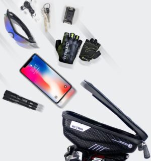 Die WILDMAN Fahrradtasche für den Lenker ist eine praktische Tasche, mit der Sie kleine Gegenstände verstauen und gleichzeitig Ihr Handy während der Fahrt nutzen können – Navigation und Musikwiedergabe stets griffbereit.
